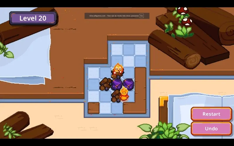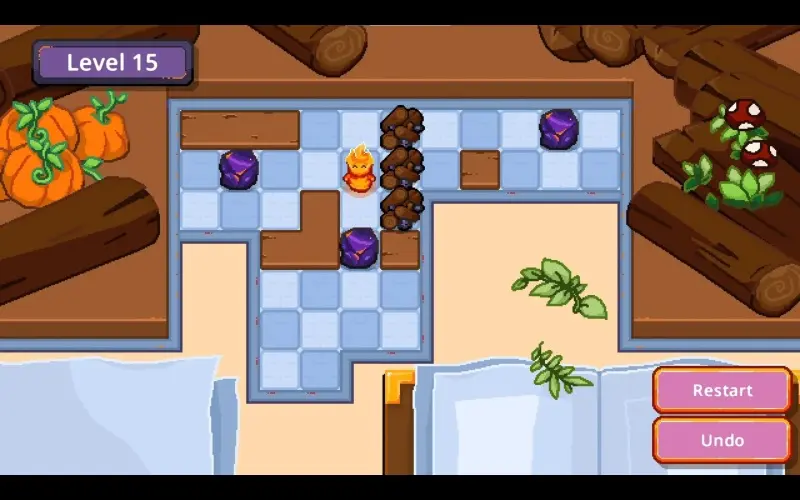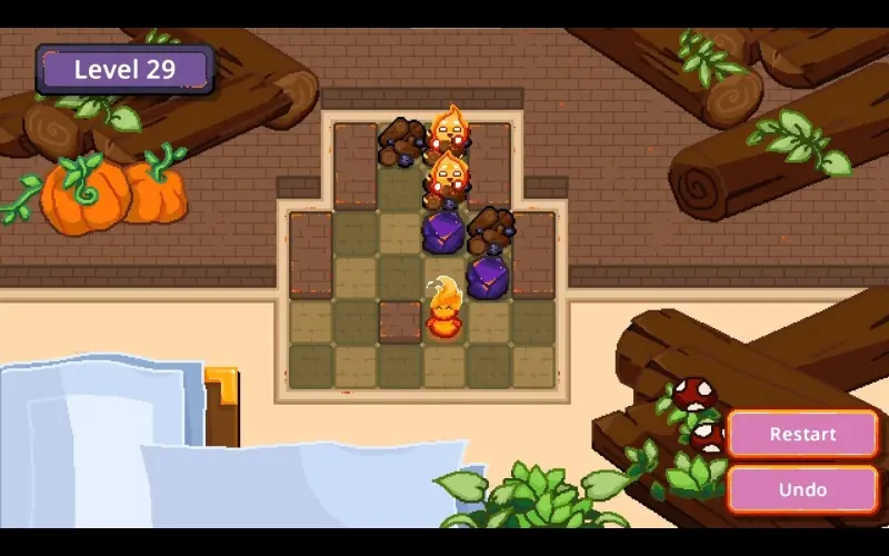 Un petit esprit de feu se déplace case par case dans une cheminée chaleureuse en pixel-art. Sa mission est de pousser des morceaux de charbon pour rallumer les feux éteints. Éteignez tous les feux pour apporter chaleur et charme à chaque recoin du foyer.