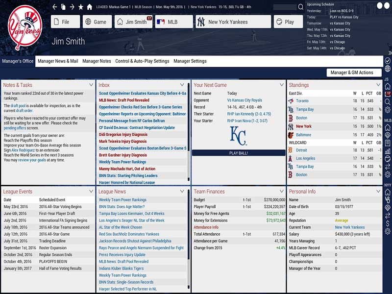 Incarnez un directeur général ou un responsable local de votre franchise préférée du monde réel, ou rassemblez une équipe de votre choix parmi les principales équipes de ligues de 1901 à 2015. Le jeu vous donnera une expérience pratique de la gestion d’une équipe de baseball. Vous devrez tout organiser depuis le choix de la file, de la stratégie de jeu et des lanceurs.