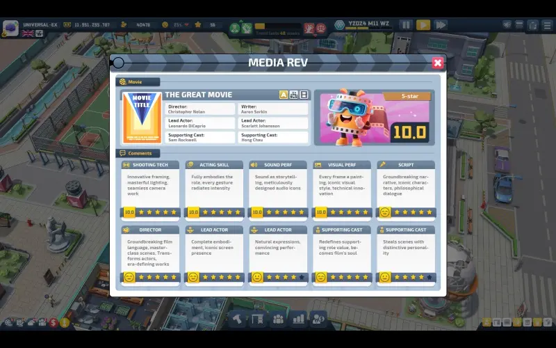 Devenez un magnat du cinéma dans Super Movie Tycoon et bâtissez votre empire hollywoodien à partir de rien. Gérez chaque étape de la production, de l’écriture du scénario au casting, en passant par les décors et les effets spéciaux. Recrutez les meilleurs talents, optimisez votre studio et transformez vos idées en véritables blockbusters. Utilisez une gestion stratégique et votre créativité pour dominer les festivals internationaux.