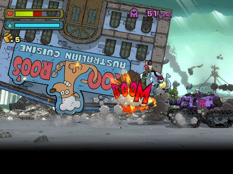 Dans des graphismes en 2D, vous voila donc dans la peau de Tembo, et vous devez parvenir à sauver Shell City de la menace de mystérieux commandos (l’armée Phantom).