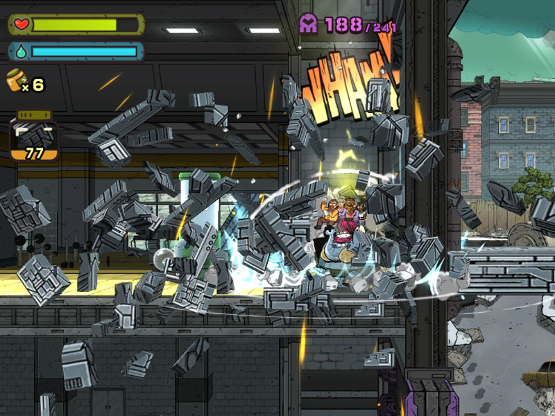 Les graphismes 2D rappellent les anciens jeux, la bande son est très bien faite et le gameplay permet de nombreuses interractions notamment avec les décors qui sont particulièrement destructibles.